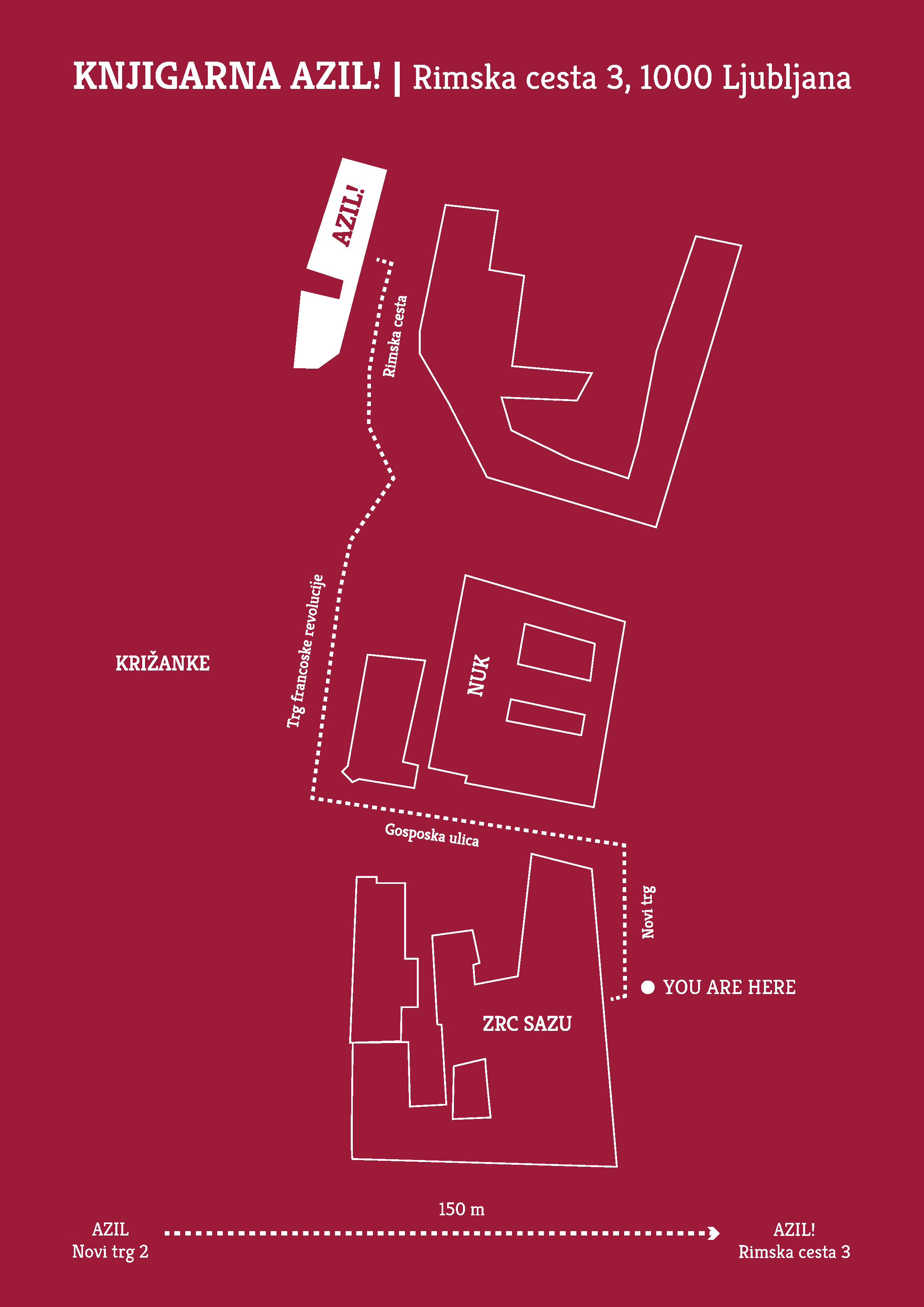 Knjigarna Azil je prostor za knjige, ki mislijo, in za bralce_ke, ki želijo (si upajo) misliti z njimi. Kot prva slovenska akademska knjigarna, posvečena humanistiki in družboslovju, združuje dela, ki odpirajo vsa aktualna vprašanja našega časa: o oblasti in svobodi, identitetah in manjšinah, zgodovinskem spominu in prihodnosti, ekologiji, ekonomiji ter družbeni pravičnosti. Na njenih policah se srečujejo in prepletajo filozofija, sociologija, zgodovina, antropologija, umetnost, politična teorija in vse vmes, naj gre za domače ali tuje izdaje, klasična besedila ali sodobne razprave – vsi dobijo svoj glas. Kot matična knjigarna Založbe ZRC ponuja tudi celoten nabor njenih izdaj, hkrati pa ostaja odprta za širši mednarodni intelektualni prostor. Humanistično in družboslovno večglasje dopolnjujeta še izbrano leposlovje v slovenskem in angleškem jeziku ter stripovski kotiček za vse, ki svet raziskujejo tudi skozi podobe. Zaradi obnove prostorov na Novem trgu 2 knjigarna začasno deluje na Rimski cesti 3 – a njeno mesto ostaja tam, kjer so knjige, kultura in svoboda duha.
